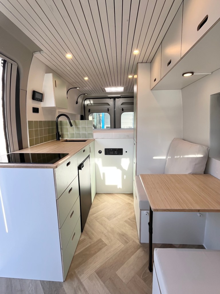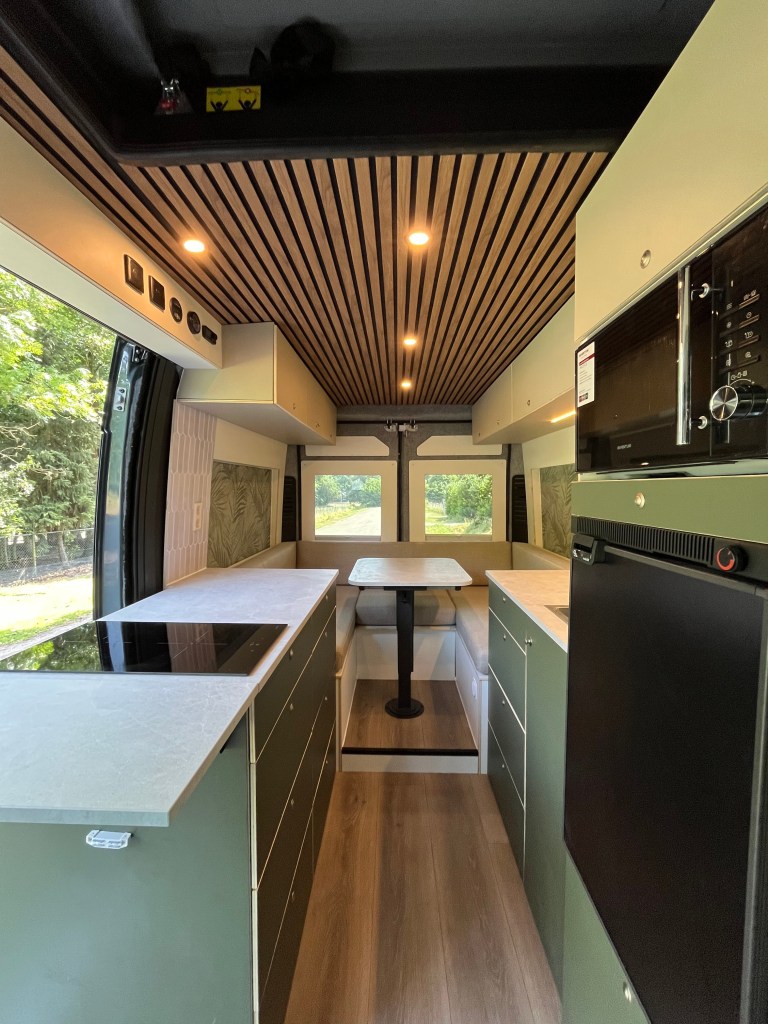 Wij gebruiken alleen hoogwaardige materialen die lang meegaan. Zo worden alle meubels machinaal CNC gefreesd en afgewerkt met een HPL toplaag. Hierdoor is het interieur kras- en stootvast en gaat het jaren lang mee. Daarbij heb je eindeloos veel mogelijkheden in kleuren of prints. Ook gebruiken we graag massief hout voor de tafel, het aanrecht en het plafond. Benieuwd hoe dit eruit ziet of aanvoelt? Kom lang bij de werkplaats.